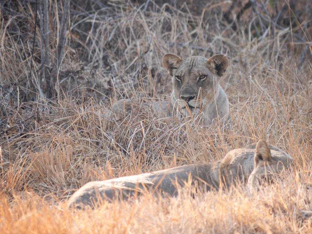 We arrive to a bit of a melee of safari vehicles. I count around eight vehicles and we’re the last to arrive. Three vehicles are on the north side of the scene on the road. And the remaining four are fanned out with two of them sitting on the side of the road. All of the vehicles have turned their engines off and some are pointing lights at the pride of lioness in front of us. There are three lioness that we can see standing on the right hand side of the road looking down a large culvert. Our guide breaks to the right and parks well to the side of the furthest vehicle.